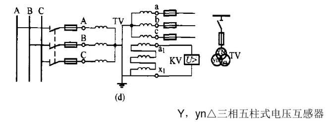 4.一臺三相五芯柱電壓互感器接成YN/YN/Δ(開口三角形),如圖1(d)所示。接成Y0形的二次線圈供電給儀表、繼電器及絕緣監察電壓表等。輔助二次線圈接成開口三角形,供電給絕緣監察電壓繼電器。當三相系統正常工作時,三相電壓平衡,開口三角形兩端電壓為零。當某一相接地時,開口三角形兩端出現零序電壓,使絕緣監察電壓繼電器動作,發出信號。