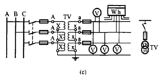 3.三個單相電壓互感器接成YN/YN形,如圖1(c)。可供給要求測量線電壓的儀表和繼電器,以及要求供給相電壓的絕緣監察電壓表。